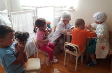 В первой младшей группе создали уголок для сюжетно-ролевой игры "Больница".Дети с большим удовольствием , желанием,интересом вошли в эту игру.Цель игры расширять знания детей о професси врача:что делает врач,кого он лечит,чем он лечит.Учить проявлять заботливое отношение к игрушкам. ( Восп. Хуснулина Г.Г.)