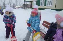 Уртанчылар төркеме балалары саф һавага чыккач файдалы хезмәт белән шөгыльләнергә яраталар. Менә бүген дә алар ничек тырышып кечкенә көрәкләр белән кар көриләр. Уйнар өчен мәйданчык әзерлиләр. ( тәрбияче Шарипова Ф.М).