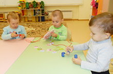 Воспитанники 1 младшей группы упражняются в нанизывании и учатся выкладывать и вкладывать матрёшки.