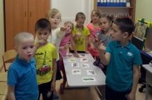 На снимке – дети подготовительной группы на занятии английского языка. Дети повторяют за педагогом в момент пальчиковой гимнастики. Пальчиковая гимнастика необходимо для поднятия настроения и развития мелкой моторики рук, что благотворно сказывается на увеличении лексического словарного запаса детей.