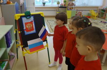 "Россия- зур дәүләт. Халыклар бердәмлеге" атналыгы кысаларында уртанчылар төркеме балалары белән Россия флагы һәм гербы белән таныштык. (Тәрбияче Шарипова Ф.М.).