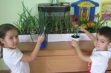 Тәрбияви бурычларны тормышка ашыру максатыннан уртанчылар төркемендә (тәрбиячеләре Солтанова Г.Г. Ибатуллина И.С.һәм тәрбияче ярдәмчесе Загидуллина Х.Х) җитәкчелегендә бик күп кырлы эш алып барыла. Табигать почмагында яшь үзенчәлекләренә туры килә торган гөлләр: бегония, алоэ, фиалка.традескан- ция,герань утырттык. Балалар һәр көнне гөлләрнең ничек үскәнен, чәчәк атуын күзәтәләр, төпләрен йомшарталар, тузанын сөртәләр, сулар сибәләр. Әгәр тәрбияләмәсәң, аларның шулай үсмәячәген, үсемлекләрнең тере табигать икәнен, аларның үсешенә һава, су, яктылык кирәклеген үз күзләре белән күрәләр. Кышын тәрәзә төбендә суган үстердек , аның үсешен күзәтеп,әңгәмәләр үткәрү шигырь-табышмаклар өйрәнү,суганның файдалы якларын ачу балалар өчен бик кызыклы булды. Һәм бу эшнең нәтиҗәсе гаиләдә бала үстергән суганнан файдалану балада хезмәт тәрбиясе алу, хезмәткә хөрмәт уятты.