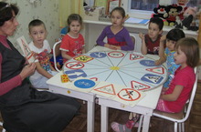 Широва Г.Г. балалар белән "Поле чудес" уенында балаларга юл хәрәкәте иминлеге кагыйдәләрен өйрәтә.