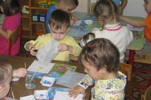 2 нче кечкенәләр төркемендә иҗади сәнгать (кисеп ябыштыру) шөгылендә балалар төсле кәгазь, пумала, салфетка белән эш итә беләләр.
