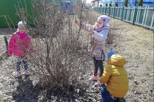 С целью закрепления о том, что любое дерево, кустарник - живое существо, на прогулке с детьми было проведено наблюдение за кустарником сирени, растущим на территории детского сада. Воспитанники проверили, как перезимовал кустарник (имеются ли поломанные ветки), какие произошли изменения, какое состояние кроны, веток. Рассмотрели почки, как они расположены, отметили, что скоро из почек появятся зеленые листочки. Затем ребята очистили кустарник от сухих веточек, убрали мусор вокруг него.