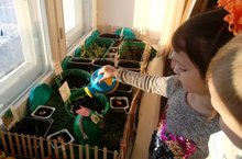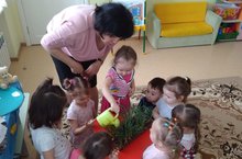 Без мәктәпкә әзерлек төркеме балалары белән тәрәзә төбендә бакча ясадык. Анда суган, борчак, солы һәм бодай утырттык. Балалар белән без аларга су сибәбез, тишелеп чыкканын күзәтәбез. Аны балалар түземсезлек белән көтәләр. Инде солы белән бодай тишелеп чыкты. Бу балаларга экологик тәрбия бирүнең мөһим бер алымы булып тора. ( Тәрбияче Шарипова Ф.М).