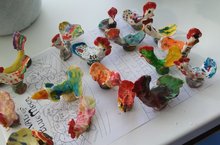 Бүген зурлар төркеме балалары кисеп ябыштыру шөгылендә Экияти кош образын аерым олешлэрен hэм сурэт детальлэрен бизэргэ ойрэнделәр. Активлык, ижадилык, матур эшлэрне аера белу, алар турында сойлэу, кузаллауны устеру максаты куелган иде. Рэсемдэ поэтик образ тудырырга, туры килуче тослэр гаммасын сайларга ойрэту бурычы куелды. Акварель белэн ясау, пумала hэм буяулар белэн дорес куллана белулэрен ныгыту остендә эшләнде. Образлы, эстетик кузаллауларын устерүгә басым ясалды. Экияти кош образын бизәү балаларда зур кызыксыну уятты. Алар шөгыльдә бик теләп катнаштылар.