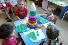 Икенче кечкенәләр төркеме балалары ябыштыру шөгылендә (тәрбиячеләре Хазиева А.Х.) уенчык образларын(пирамида) чагылдырырга өйрәнделәр. Детальләрне зурлыклары буенча дөрес урнаштыруга ирештеләр. Җилемне пумалага кирәк кадәр генә алып әзер түгәрәкләрне дөрес итеп ябыштырдылар. Балалар үзләренең эшләреннән бик канәгать калдылар.