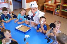 Шалкан әкияте герое чи-чи тычкан беренче кечкенэлэр төркеменә кунакка килде бүген. Бармак театры геройлары белән бергәләп Абдулла Алишның Куян кызы әкиятен сөйләде. Балалар үзләре дә тычкан роленә керделәр.
