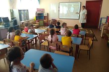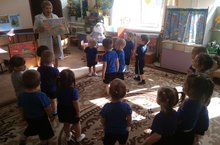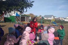 Тәрбияче Богавеева Г. Ш. җитәкчелегендә әвәләү шөгеле үтте. Балалар янына кунакка куян килә. Аның да балалар белән уйныйсы килгән. Балалар куянга бакча алдындагы качелилар, гөмбәләр, өйләр төзелгән макетны күрсәттеләр.
