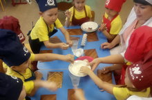 "Икмәк яшәү терәге" атна темасына нигезләнеп бүген уртанчылар төркеме балалары тозлы камырдан йомры икмәккә дуслар әвәләделәр. Башта онның,камырның үзлекләре белән таныштылар, аннан камырны суга,буяга салып тәҗрибә үткәрделәр.