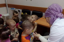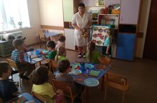Бүген ясле төркеме шәфкать туташы Наилә апалары янына кунакка килделәр. Ул балаларны үзенең һөнәре һәм бүлмәдәге балаларның сәламәтлекләрен тикшереп торуче әсбаплар белән таныштырды. Балалар кызыксынып тыңладылар. Аларга кунакка бару бик ошады.