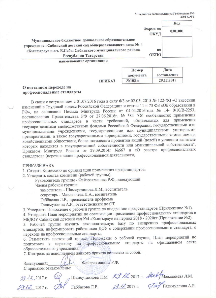 Приказ "О поэтапном переходе на профессиональные стандарты",