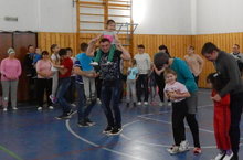 Әти - әниләр, балалар белән берлектә, мәктәпнең спорт залында бик күңелле чара үткәрелде. Спорт уеннарыннан бер гаиләдә читтә калмады. Уеннар җыр- биюләр белән үрелеп барды.