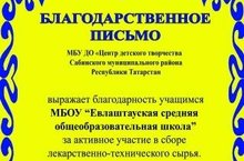 Районыбыз дару үләннәре тапшыру буенча Республика күләмендә II урынга лаек булды. Мәктәбебез укучылары да дару үләннәре җыю акциясендә актив катнашты. Мәктәбебезгә "Рәхмәт хаты" тапшырылды.