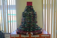В школьной библиотеке появилась «Зелёная книжная красавица»! Вновь решили удивить своих читателей новогодней скульптурой.