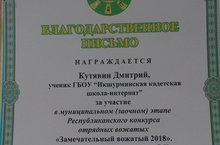 "Замечательный вожатый" 06.02.2018 Ученик 10 класса Кутявин Дмитрий- самый активный ученик школы во всех отношениях. Он не только успевает заниматься науками, но и занят общественной жизнью в школе.Он - старший вожатый школы. В муниципальном конкурсе "Замечательный вожатый" наш Дима Кутявин был награжден Благодарственным письмом. Мы желаем Диме дальнейших успехов.
