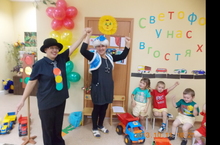 На празднике участвовали Светофор и Зайчик- который не знали о правилах дорожного движения. Детишки с огромным желанием научили Зайчика как вести себя, чтобы с ним не случилось беда. Ребятишки читали стихи для Зайчика про светофор и зебру. Играли игру «Собери светофор». Особенно понравилась им игра «Зажги светофор».