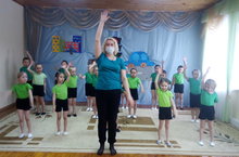 Старшая разновозрастная группа тоже рне осталась в стороне, делают утреннюю гимнатику всей группой.