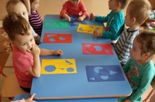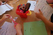 Младшая разновозрастная группа учится вырезанию из бумаг. Очень полезное занятие, ведь оно предоставляет нагрузку для укрепления пальчиков, что в свою очередь развивает мелкую моторику (улучшается координация движений пальцев, а это способствует образованию новых нейронных связей, т.е. развитию мышления ребенка). После освоения ножниц ребенок активно подключает вырезание к рисованию и аппликации.