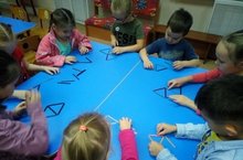 всем знакомые счетные палочки, можно использовать не только, для того чтобы научиться считать. Многофункциональная развивающая игрушка, может принести большую пользу в обучении и развитии ребенка. Старшая разновозрастная группа на занятии составлял из счетных палочек 3 равных треугольника.