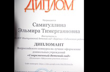 Воспитатель Самигуллина Эльмира Тимергаяновна стала Дипломантом на Всероссийском конкурсе на лучшее оформление дошкольных учреждений "Современный детский сад"(Номинация "Оформление участков летом"). Желаем ей дальнейшего успеха!!!
