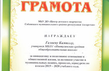 Активистка ДШД, Галиева Камилла, награждена Грамотой за инициативу и позитивное отношение к общественной жизни, за активное участие в муниципальных акциях, проектах, конкурсах по итогам 2019-2020 учебного года.