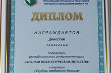В 2017 году наша династия приняла активное участие в республиканском интернет – конкурсе «Лучшая педагогическая династия». И стала победителем конкурса в номинации «Сердце, отданное детям». Династия была награждена дипломом Общероссийского профсоюза образования, Татарской республиканской организации профсоюза работников народного образования и науки РФ»». -