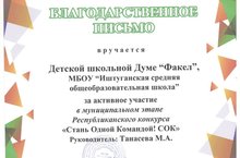 Детская школьная Дума «Факел» награждена Благодарственным письмом за активное участие в муниципальном этапе Республиканского конкурса «Стань Одной Командой! СОК» (рук. Танасева М.А.)