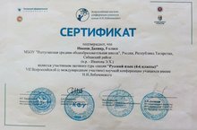 Ежегодно Казанский федеральный университет при содействии министерства образования и науки РТ проводит олимпиады Winkid по основным школьным предметам для учеников 1-8 классов. Учащиеся нашей школы приняли активное участие и показали хорошие результаты. Халилов Ильназ (призёр), Князькова Полина (победитель) по английскому языку (учитель Галимзянова А.Х.), Капитонов Максим (победитель) по математике (учитель Фахрутдинова С. А.), Иванов Данияр (абсолютный победитель) по русскому языку (учитель Иванова Э. Х.). Поздравляем их и желаем им дальнейших успехов.