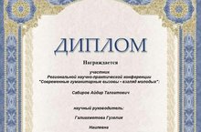 Учащиеся школы Никитина Дарья (8 кл.), Петрова Оксана (9 кл.) – научный руководитель Иванова Э.Х, Сабиров Айдар (11 кл.) – научный руководитель Галиахметова Г.Н. приняли участие в Региональной научно-практической конференции «Современные гуманитарные вызовы - взгляд молодых». Участники награждены Дипломами участника.