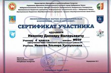 Учащиеся школы Иванов Данияр (4 кл.) рук. Иванова Э.Х, Устун Замир (5 кл.) рук. Галиахметова Г.Н. приняли участие в Республиканской научно-практической конференции «Новый интеллект». Участники награждены Сертификатами участника.