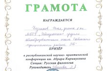 Учащиеся школы Никитина Дарья (8 кл.), Казанков Илья (8 кл.), Микаилова Эльвира (10 кл.) приняли участие в VI Республиканской научно-практической конференции им. Абрара Каримуллина. Участники участвовали в секциях: «Русская филология» (рук. Иванова Э.Х.), «Татарская филология» (рук. Маркелова Л.Г.), «История» (рук. Николаева О.В.). Участники награждены Сертификатами участника, а Казанков Илья стал призёром и награждён Грамотой.