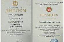 11нче сыйныф укучысы Гыйбадуллина Айзилә татар теленнән республика олимпиадасы призеры булды (укытучысы Хадиева Г.Ә.).