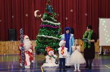 Дети пришли на представление нарядные, весёлые в предвкушении праздника. И их надежды оправдались. Воспитатели и помощники воспитателей, участвовавшие в новогоднем представлении, проявили себя хорошими артистами, показав всё своё творческое мастерство, артистизм, задор и организаторские способности. Им пришлось перевоплотиться в разных героев: Лису, Каркушу, Снегурочку, Деда Мороза и даже в задорного Снеговика! С самого начала представления сказочные герои увлекли детей в волшебный мир сказки. Дети смогли окунуться в праздничную атмосферу приключений, поучаствовать в интересных конкурсах. С появлением Деда Мороза начался настоящий праздник с песнями и танцами, хороводами вокруг ёлки. После представления дети читали стихи Деду Морозу и Снегурочке, фотографировались с персонажами, получали новогодние подарки.