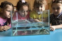 Бүген балалар, "Мин йорт хайваннарын ничек тәрбиялим", дигән темага сөйләштеләр.Соңыннан ташбаканы ашаттылар,суын алмаштырдылар.Йорт хайваннарына сакчыл,мәрхәмәтле булырга кирәклеген тагын бер кат исләренә төшерделәр.