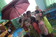 Бүген балалар белән зонтик ярдәмендә Кояш һәм Яңгыр уенын уйнадык.