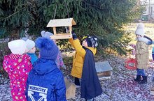 Сегодня воспитанники старшей группы развесили на деревьях участка детского сада кормушки, чтобы помочь птицам пережить холодную зиму.