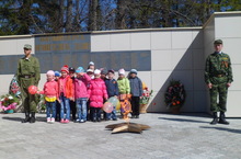 Сегодня в нашем поселке прошел праздничный парад, приуроченный к празднованию Дня Великой Победы, в котором участвовал и наш детский сад. С восхищением дети разглядывали технику парада, с глубоким уважением к павшим солдатам войны возложили цветы к памятнику неизвестного солдата. Дети старшей группы с нетерпеньем ждали этого дня.На протяжениии недели дети знакомились с историей Великой Отечественной войны, смотрели презентации о войне, разучивали стихотворения, песни, пословицы. Мы хотим, чтобы дети не забывали тех, кто отдал жизнь за счастье нашего поколения. С Днем Победы!