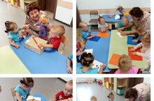 На занятии лепки дети младшей группы познакомились с новым материалом — пластилином. Учились приемам лепки, отрывать комочки от целого куска, затем раскатывать в ладоня, лепить на клееночке. Развивали мелкую мускулатуру пальцев руки.