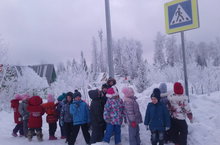 Прогулкага чыккач юл билгеләрен кабатлыйбыз һәм юл аша тиешле урыннан гына чыгарга кирәклеген беләбез.