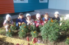 Балалар белән чәчәк тутәлендәге чупләрне утадык, су сиптек, комнан кояш нурлары ясадык, куңелләребез күтәрелде һәм чәчәкләр арасында карточкага төшәргә булдык.