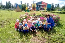 Зурлар төркеме балалары тәрбиячеләре Мөбәрәкшина Гөлнара Ганиевна белән үзләре үстергән чәчәкләр арасында.