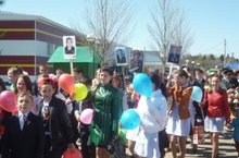 Сегодня в нашем посёлке прошёл большой праздник, посвящённый к 70 летию Великой Победы. Сначала в клубе показали инсценированное представление, концерт с силами учеников , учителей и представителями трудовых коллективов. После концерта колонна демонстрантов направилась к памятнику неизвестного солдата. Колонну возглавили боевые машины и после них ученики с портретами своих прадедов(акция «Бессмертный полк»). У памятника ученики рассказывали стихи ,организации и предприятия возложили цветы.