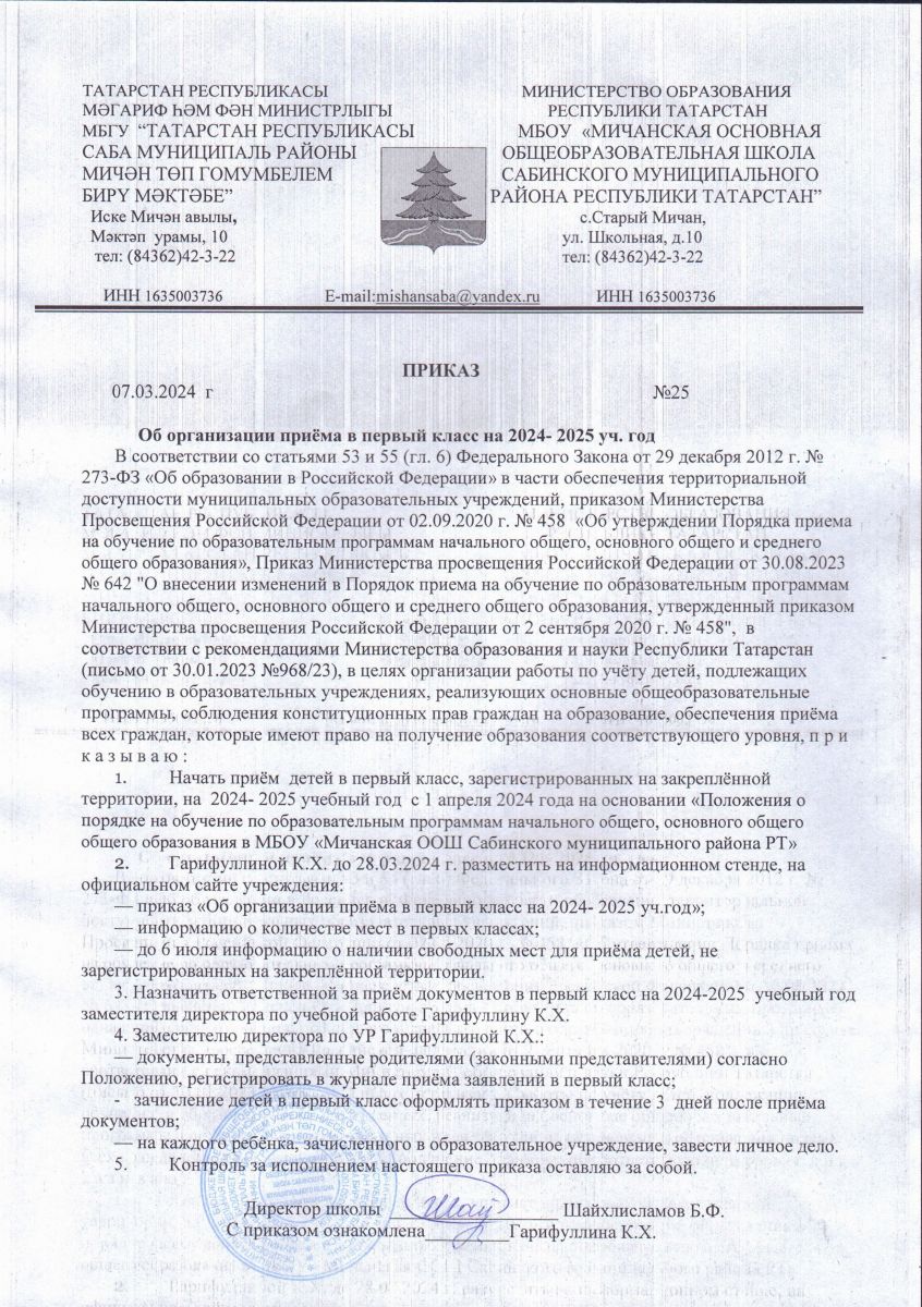 Приказ об организации приема в первый класс на 2024-2025 уч.год