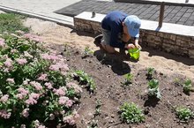 Балалар үз теләкләре белән, бик тырышып чәчәк түтәлләрен чүптән чистарталар.
