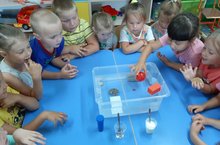 Балалар белән суның әһәмияте турында сөйләштек. Төсен, тәмен, исен ачыклап, суда нәрсәләр бата ( таш, тимер, ком) һәм нәрсәләр батмавын ( агач, пластмасса, боз) ачыклап тәҗрибәләр үткәрдек. Балаларга бик кызыклы булды, ошады.