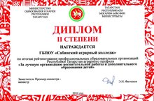 По итогам рейтингования профессиональных образовательных организаций Республики Татарстан аграрного профиля "За лучшую организацию воспитательной работы и дополнительного образования детей" ГАПОУ "Сабинский аграрный колледж" занял второе место и награжден дипломом второй степени.