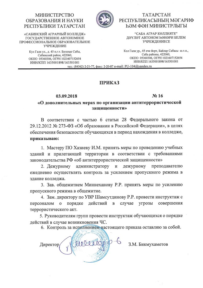 - Приказ об утверждении форм журналов по безопасности и антитеррористической защищенности ГАПОУ "Сабинский аграрный колледж"