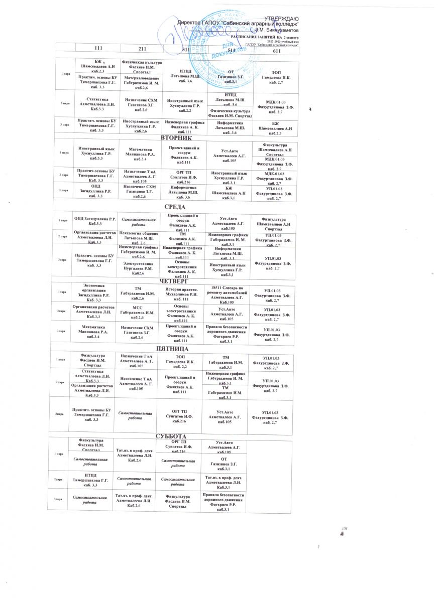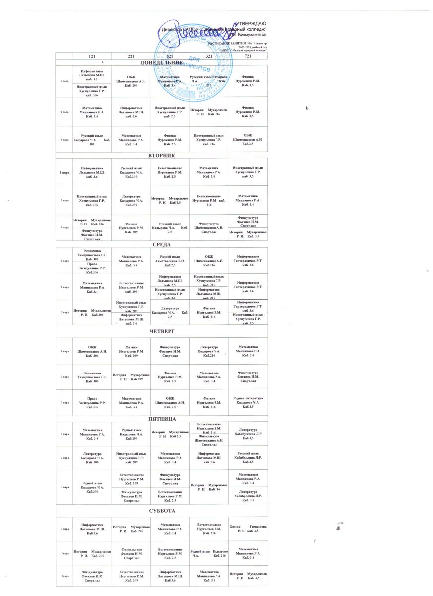 Расписание занятий на 2022-2023 учебный год 1 семестр/ Дәресләр расписаниесе 2022-2023 уку елына 1 семестр